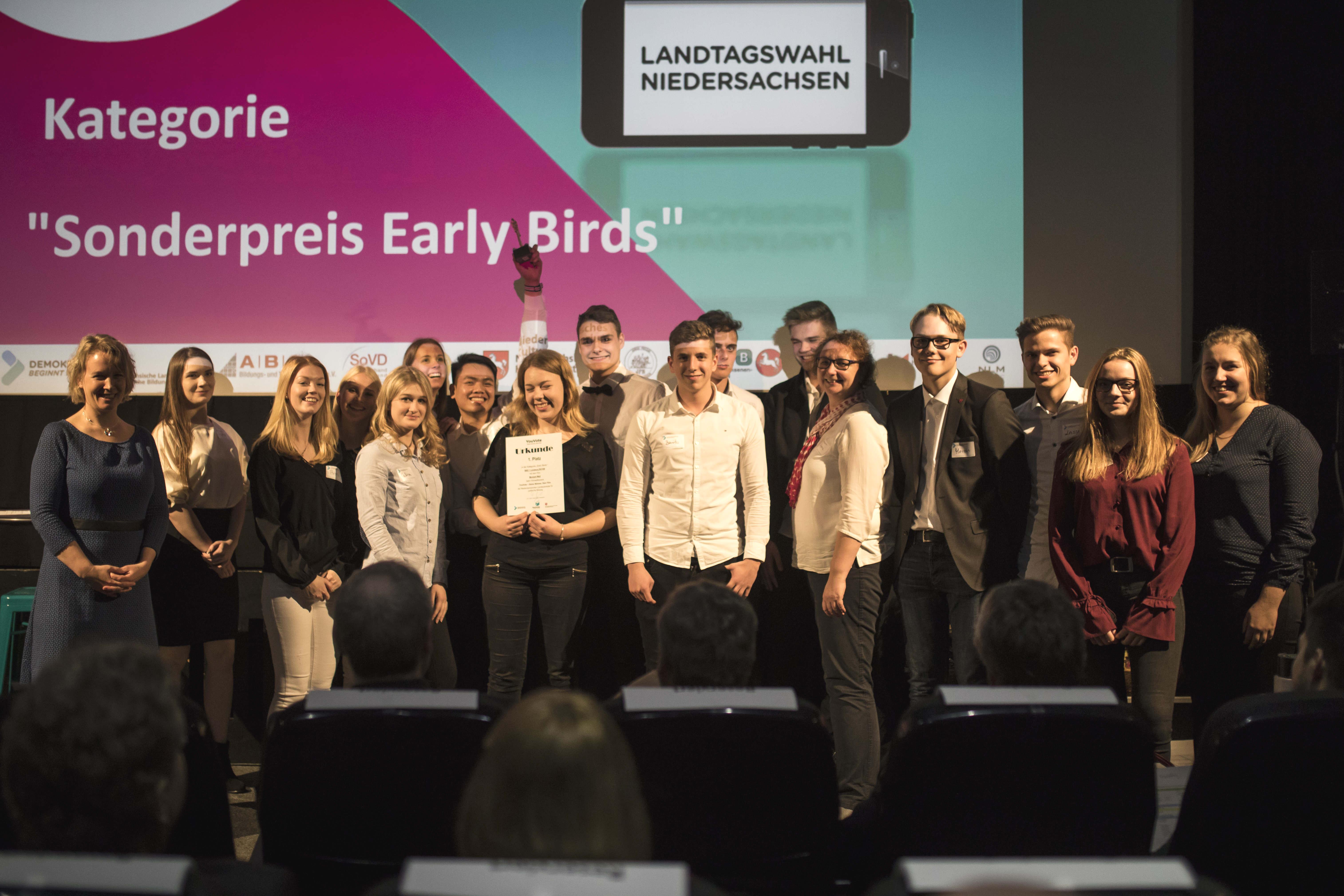 Ein Team aus Schülerinnen und Schülern der BBS1 in Lüneburg gewann mit dem Beitrag "Moment Mal!" den Early-Bird-Preis. Der Verein Politik zum Anfassen aus Hannover war mit insgesamt drei Nominierungen unter den Finalisten und Finalistinnen am häufigsten vertreten und erzielte mit dem aufwändig produzierten und kreativen Beitrag „Irre: Aliens wollen Wählen“ zwei zweite Plätze im Wettbewerb.