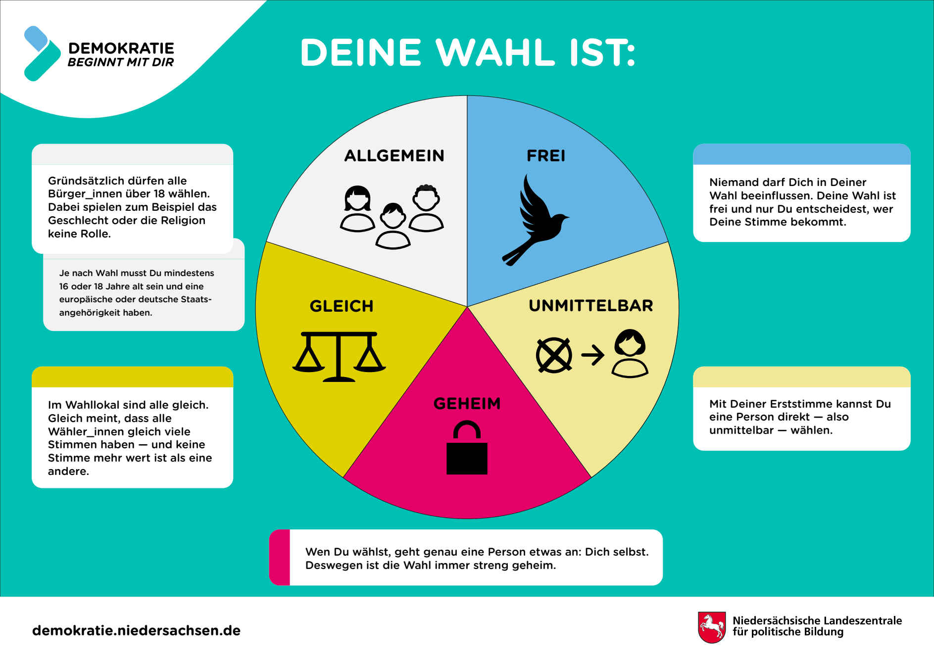 Das Wahlrecht besteht aus zwei Teilen: Dem aktiven Wahlrecht (seine_ihre Stimmen(n) abgeben) und dem passiven Wahlrecht (gewählt werden können). Um sein_ihr Wahlrecht nutzen zu können, müssen allerdings drei Bedingungen erfüllt sein: Das Wahlrecht in Niedersachsen haben ausschließlich Personen, die